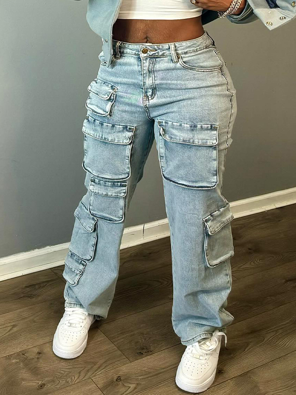 Pantalones vaqueros cargo de alta elasticidad con múltiples bolsillos y estilo de ropa de trabajo