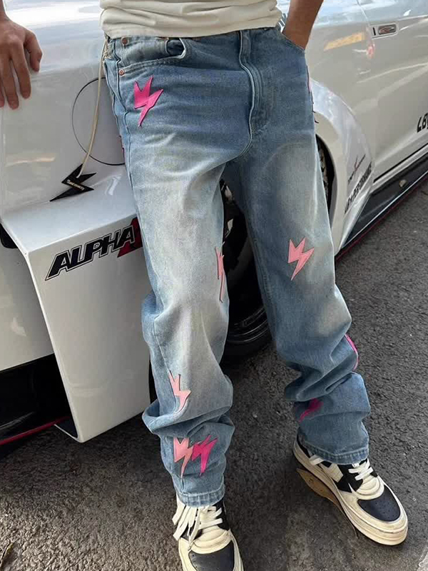 Jeans holgados con parches de cuero y rayo para hombre