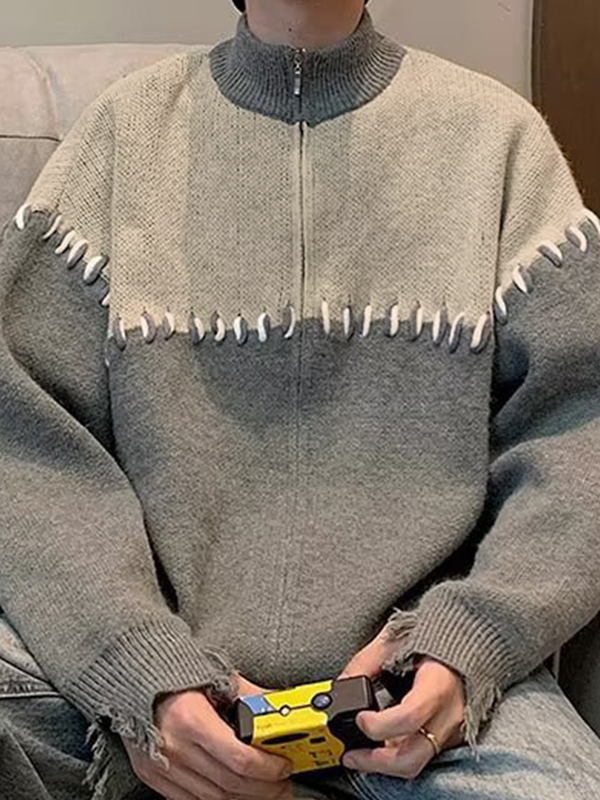 Chaqueta de punto con cremallera y diseño andrajoso de empalme para hombre